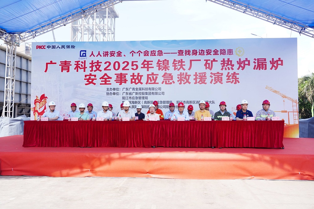 为深入学习贯彻习近平总书记关于安全生产重要论述,全面落实“人人讲安全、个个会应急——查找身边安全隐患”的安全生产月主题,6月24日,广东广青金属科技有限公司在镍铁厂举行2025年矿热炉漏炉安全事故应急救援演练。公司董事、总经理何丛珍等领导班子成员以及260多名员工代表参加演练;广新集团安全总监兼安环部总经理王磊,阳江市应急管理局基础科科长杜锋杰,阳江滨海新区应急管理局局长梁一聪,阳江高新区消防大队、中国人保阳江分公司等相关单位领导到场观摩指导。