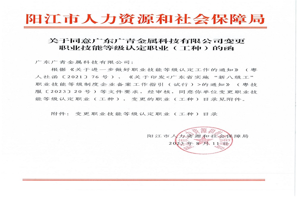 近日,广东广青金属科技有限公司成功获批电焊工、高炉炉前工、高炉炼铁操作工、轧钢工、连铸工五个工种的初级工(5级)、中级工(4级)、高级工(3级)、技师(2级)、高级技师(1级)、特级技师、首席技师七个等级的评价资格,以及电工、钳工的技师(2级)、高级技师(1级)、特级技师、首席技师四个等级的认定资格,新增工种覆盖公司五大厂区以及装备部的主要工种,标志着公司职业技能等级评价迈入“新里程”,进一步完善公司企业技能人才评价体系和高技能人才培育平台。
