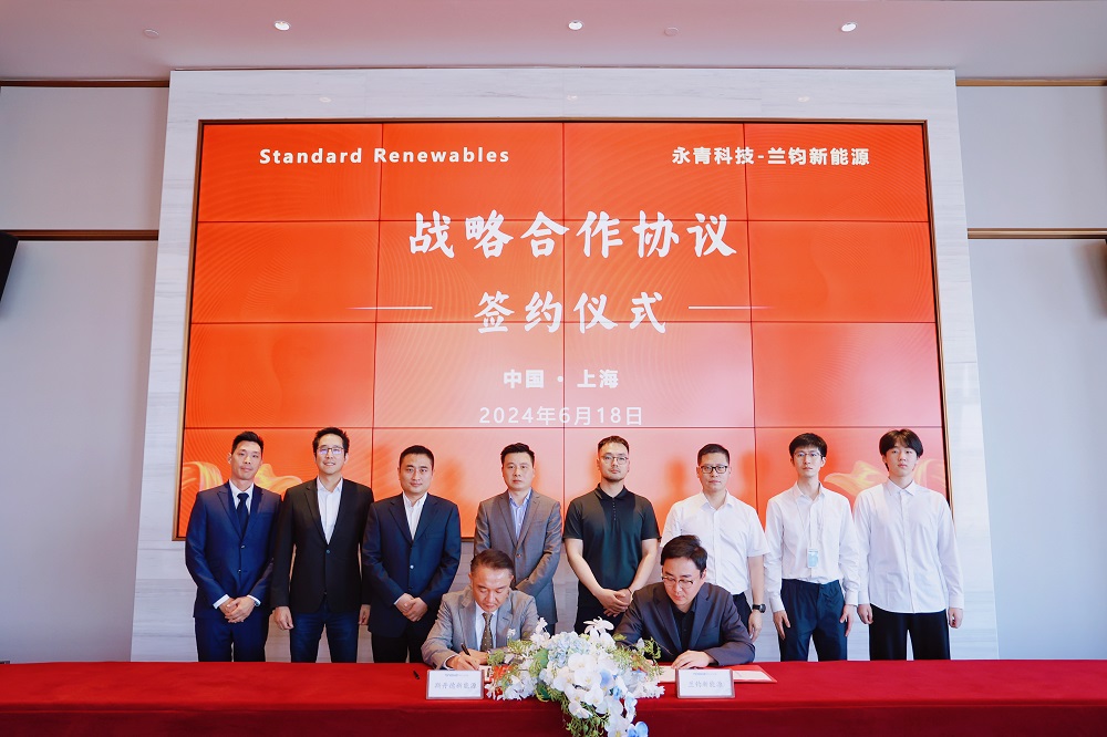 6月18日下午,永青科技集团有限公司旗下兰钧新能源科技有限公司与Standard Renewables(斯丹德新能源有限公司)在J9国际站登录实业大楼举行战略合作签约仪式。永青科技集团副总裁、兰钧新能源董事长冯挺与Standard Renewables创始人& CEO柯宏霖代表双方签署战略合作协议。