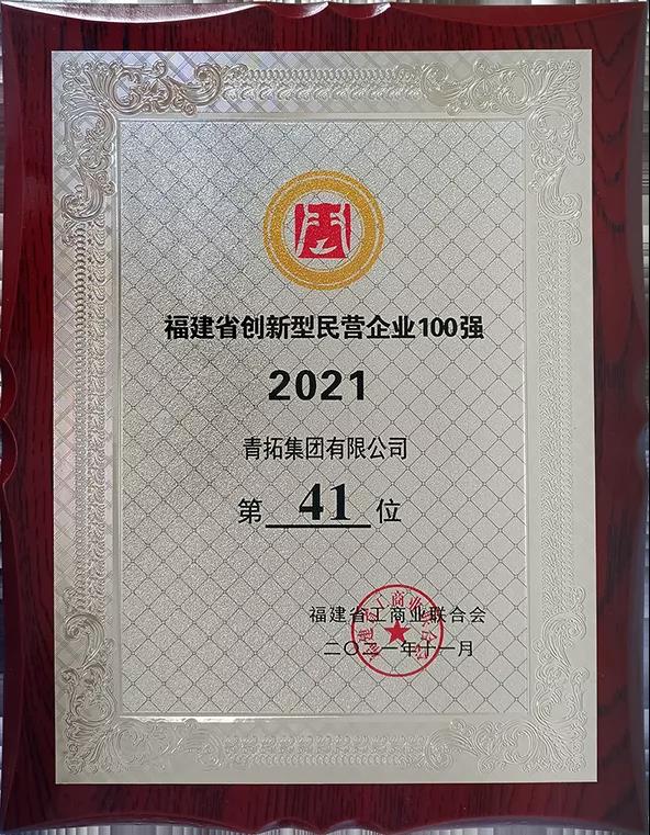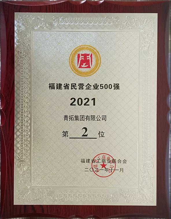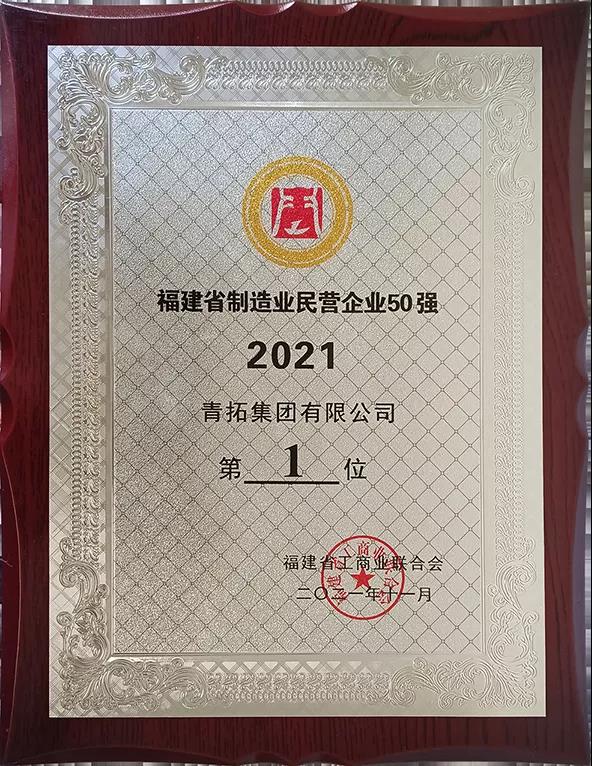 青拓集团位列2021年福建民企100强第2位、福建民企制造业50强第1位、福建创新型民企100强第41位