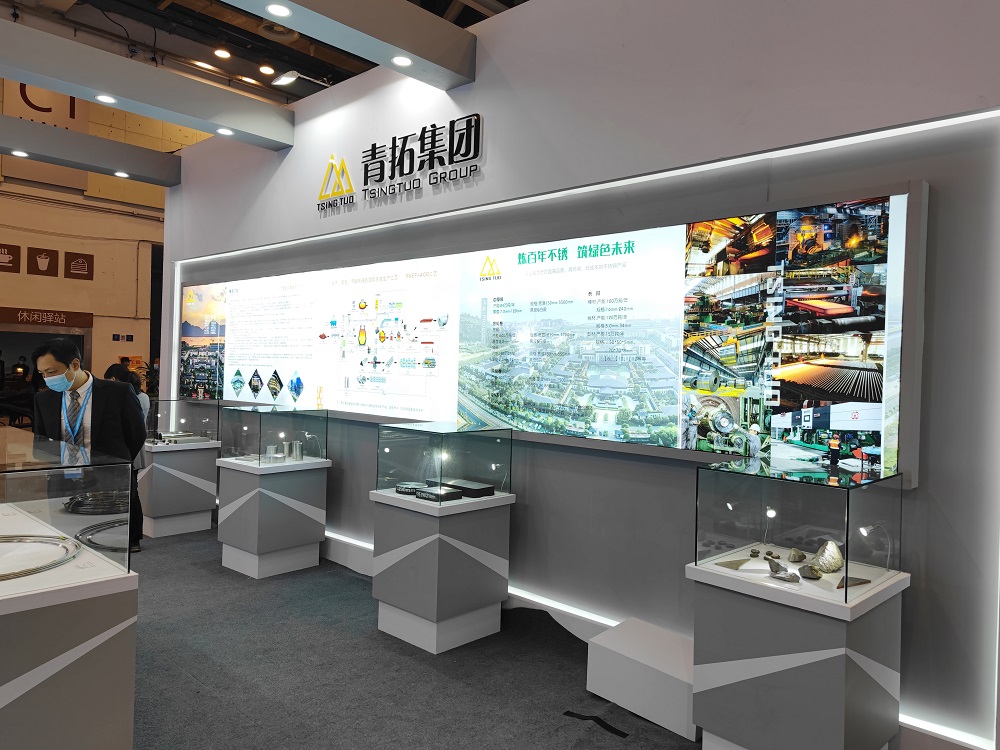青拓集团积极配合主办方工作,展台在展览中心C1展馆醒目位置,整体设计以绿色为主,展板展示企业主要发展历程、全国布局以及全球领先的工艺,展品包括矿石、板坯、热轧及冷轧产品,由青拓集团研究院创新研发的QN系、笔尖钢和手撕钢等等,都与本次展会主题“低碳、智造、升级、赋能”相互呼应、相得益彰。
